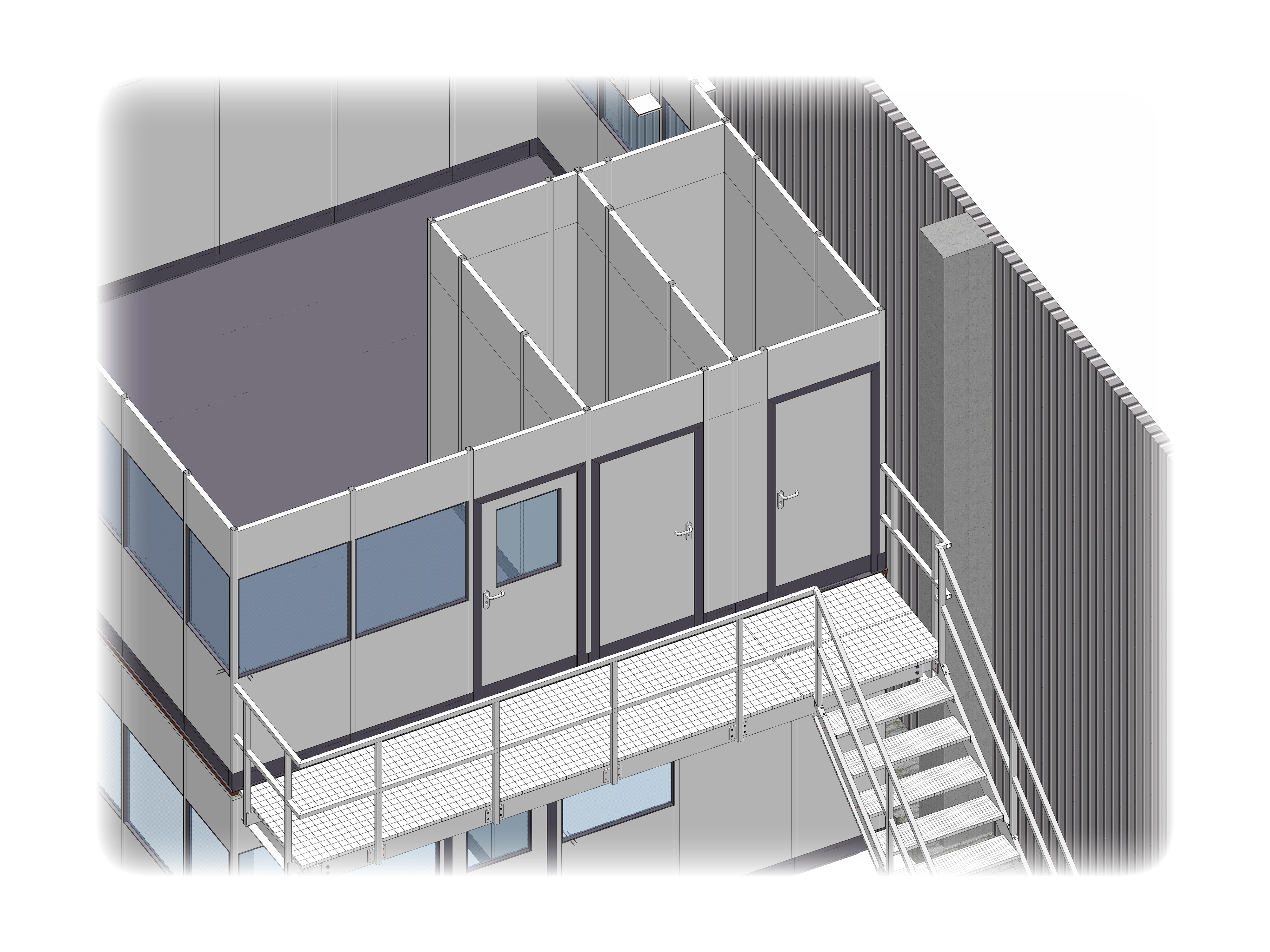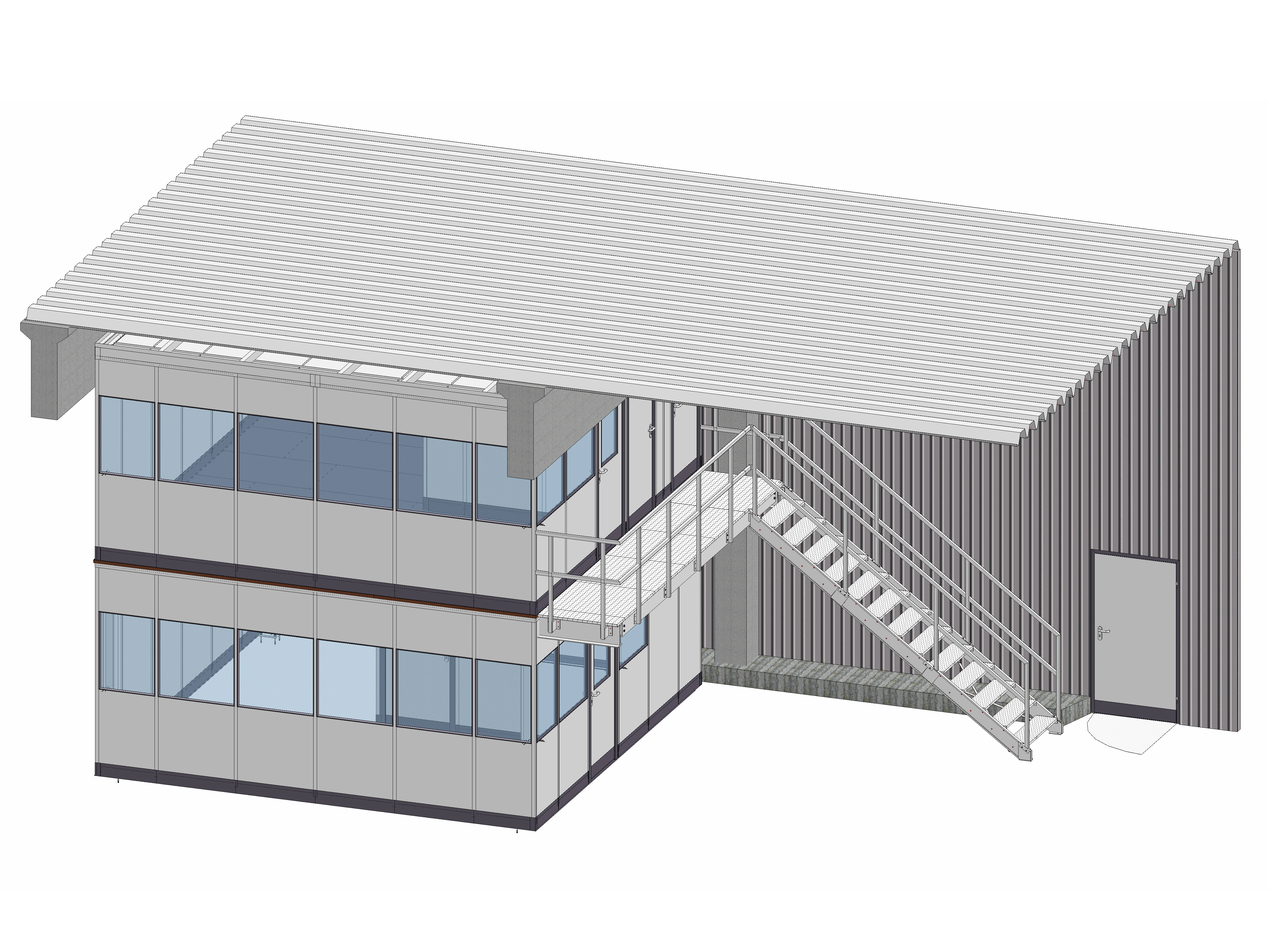 Besonderheiten - 3-seitiges Objekt, Treppenaufgang, Pausenraum, Toilettenanlage, Auskragung Stahl, Laufsteg, Geländer, Vollelemente & Sichtelemente