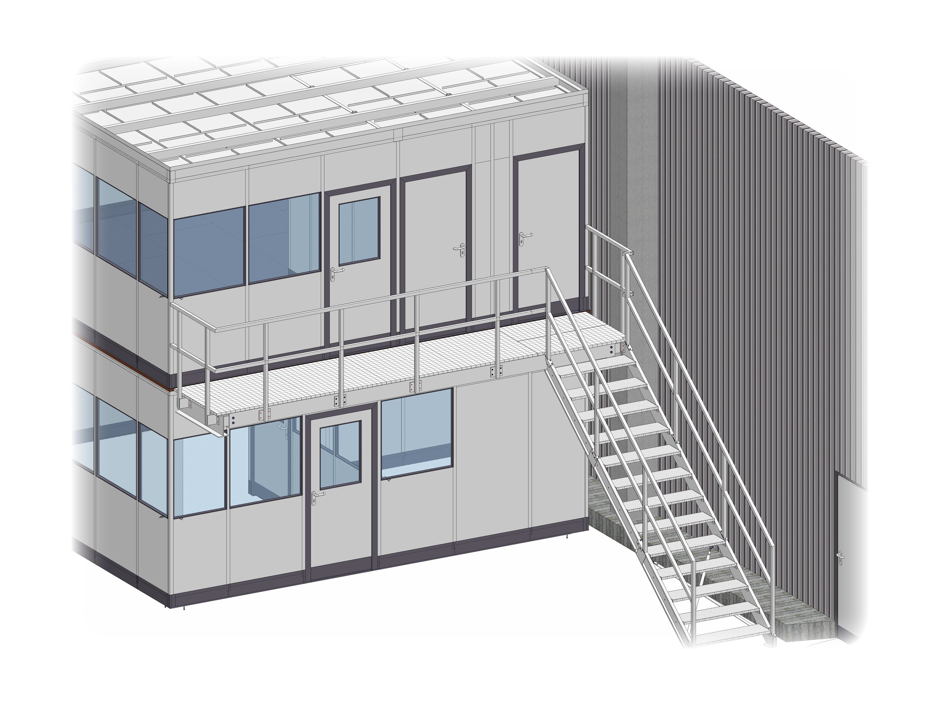 Unsere Raumsysteme eignen sich auch für komplexere Konstruktionen wie ein Doppelstockbüro mit Lagerbühne und ermöglichen unterschiedlichste Einbauten. Das abgebildete Referenzobjekt haben wir für einen in der Automobilindustrie tätigen Dienstleister geplant und realisiert. Das 5.545 x 5.545 x 5.660 mm große Objekt beherbergt Teamräume und wird auch als Pausenraum genutzt. Darüber hinaus verfügen die Teamräume auch über eine Toilettenanlage. Da es sich um ein Doppelstockbüro handelt, könnte die untere Etage alternativ auch als Lagerbühne ausgeführt werden. Eine Auskragung der Decke des oberen Stockwerk dient als Überdachung der nach oben führenden Treppe und des Eingangsbereichs der unteren Etage. Die obere Etage des 3-seitigen Objektes wird über einen außen liegenden Treppenaufgang erreicht, der auf einen Laufsteg führt. Der über die gesamte Breite der oberen Etage reichende Laufsteg ist mit einem Geländer gesichert. Das Tragwerk besteht aus pulverbeschichteten Stahlträgern und -profilen. Für die Außenwände wurden Vollelemente und Sichtelemente verwendet.