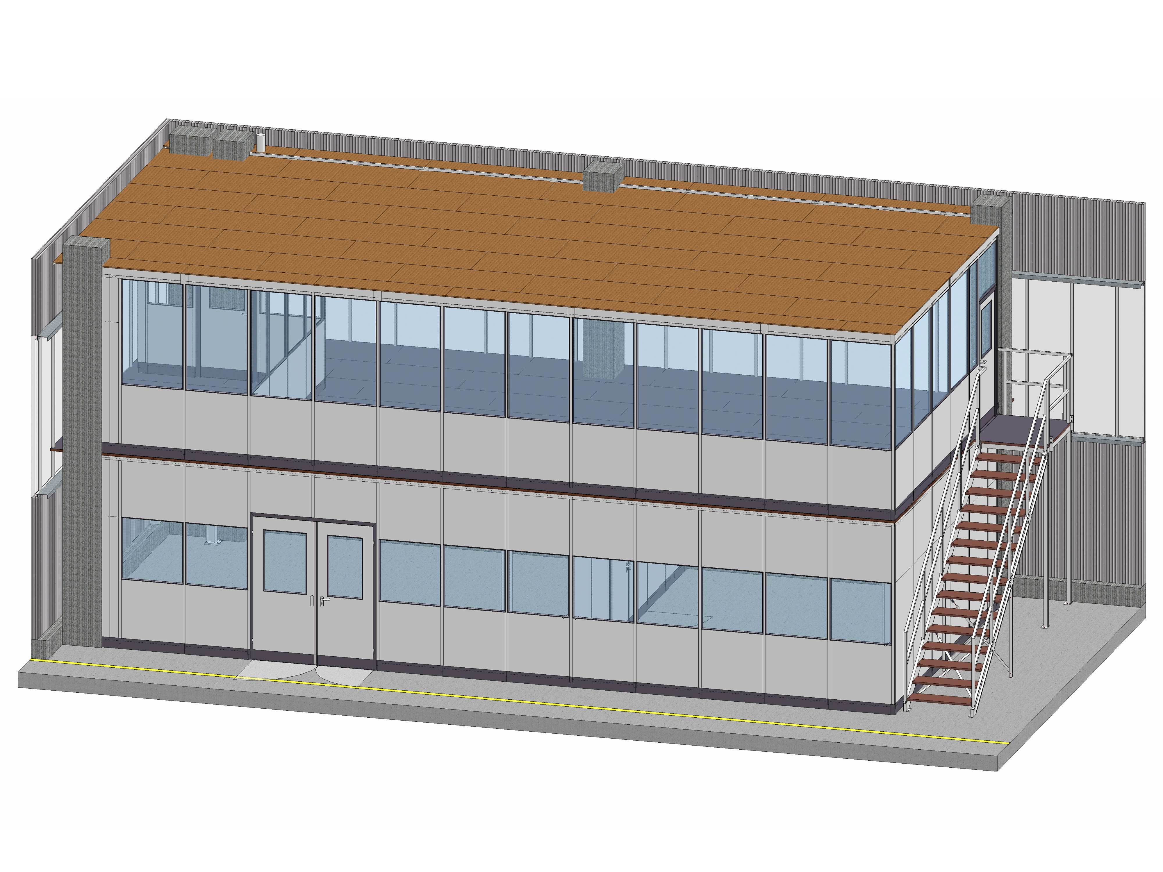 Unabhängig von den örtlichen Raumverhältnissen ermöglichen unsere Raumsysteme die unterschiedlichsten Variationen der Konstruktion und räumlichen Anordnung. Bei mehrgeschossiger Konstruktionsweise sind Bauhöhen von bis zu 6 Metern realisierbar. Das abgebildete Referenzobjekt für Raumsysteme mit den Außenmaßen von 6.045 x 6.050 x 5.962 mm haben wir für einen Automobilzulieferer entwickelt und umgesetzt. Das mehrgeschossige Objekt wurde 2-seitig ausgeführt. Die zur oberen Etage gehörenden Systemräume erreicht man über einen außen liegenden Treppenaufgang. Innen ist das Objekt durch Trennwände in mehrere Systemräume unterteilt. Drehkippfenster verbessern die Be- und Entlüftung.
