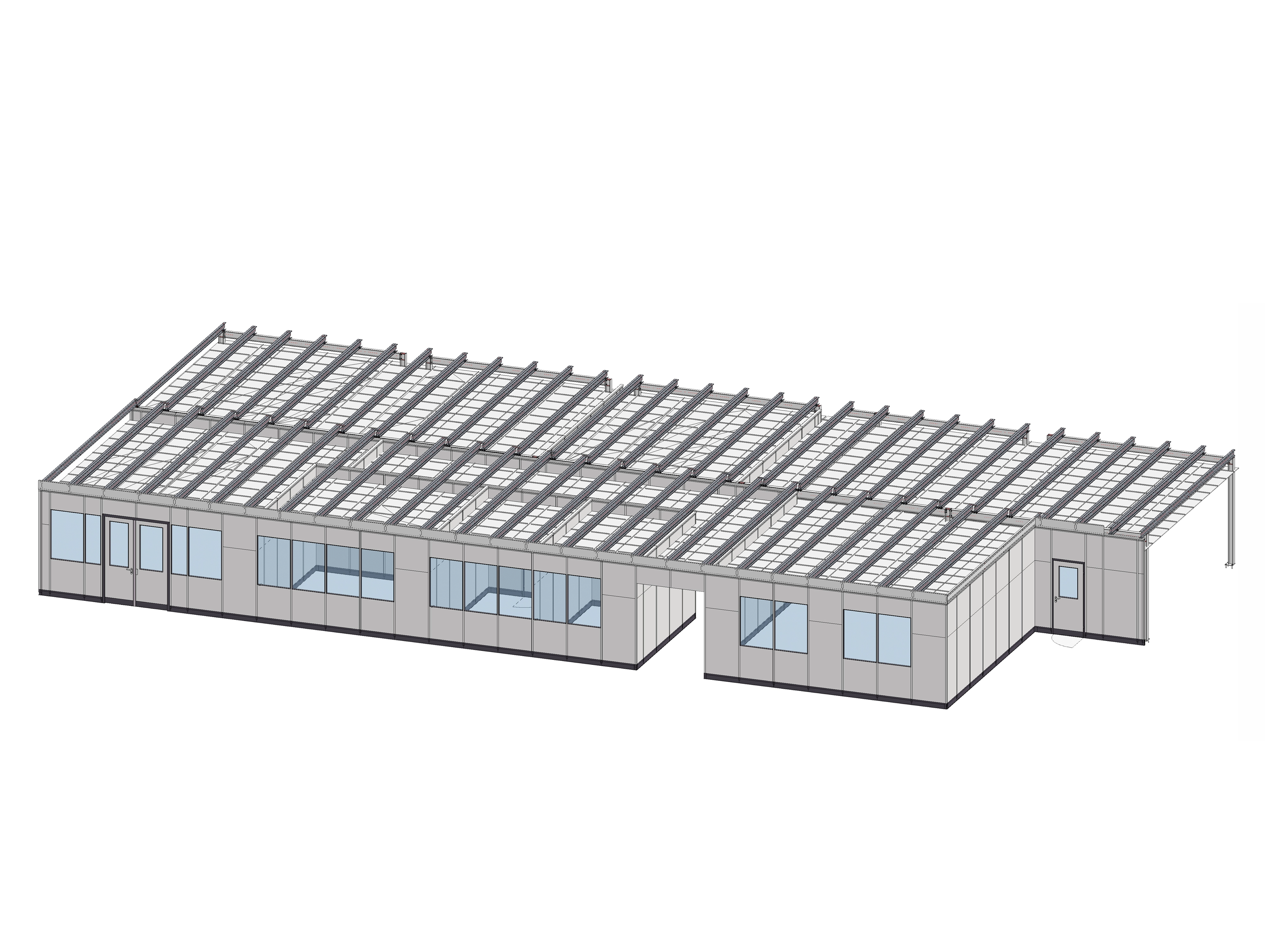 Die Planung beim Kunden führte zur Erstellung von leicht verständlichen 3D-Skizzen. Damit konnte sich unser Partner vor Ort einen ersten Eindruck von seinen gewünschten Halleneinbauten machen. In dieser Phase ist die Ermittlung von Wünschen und Einbringen von Ideen besonders einfach. Ausgehend von diesen ersten Entwürfen der Raumsysteme, haben wir mit intensiven Beratungs- und Planungsgesprächen die fertigen Konstruktionszeichnungen erstellt. Leichte Reinigungsfähigkeit, staubdichter Verschluss und eine schallgedämpfte Auslegung war eine besondere Anforderung an diese Halleneinbauten.