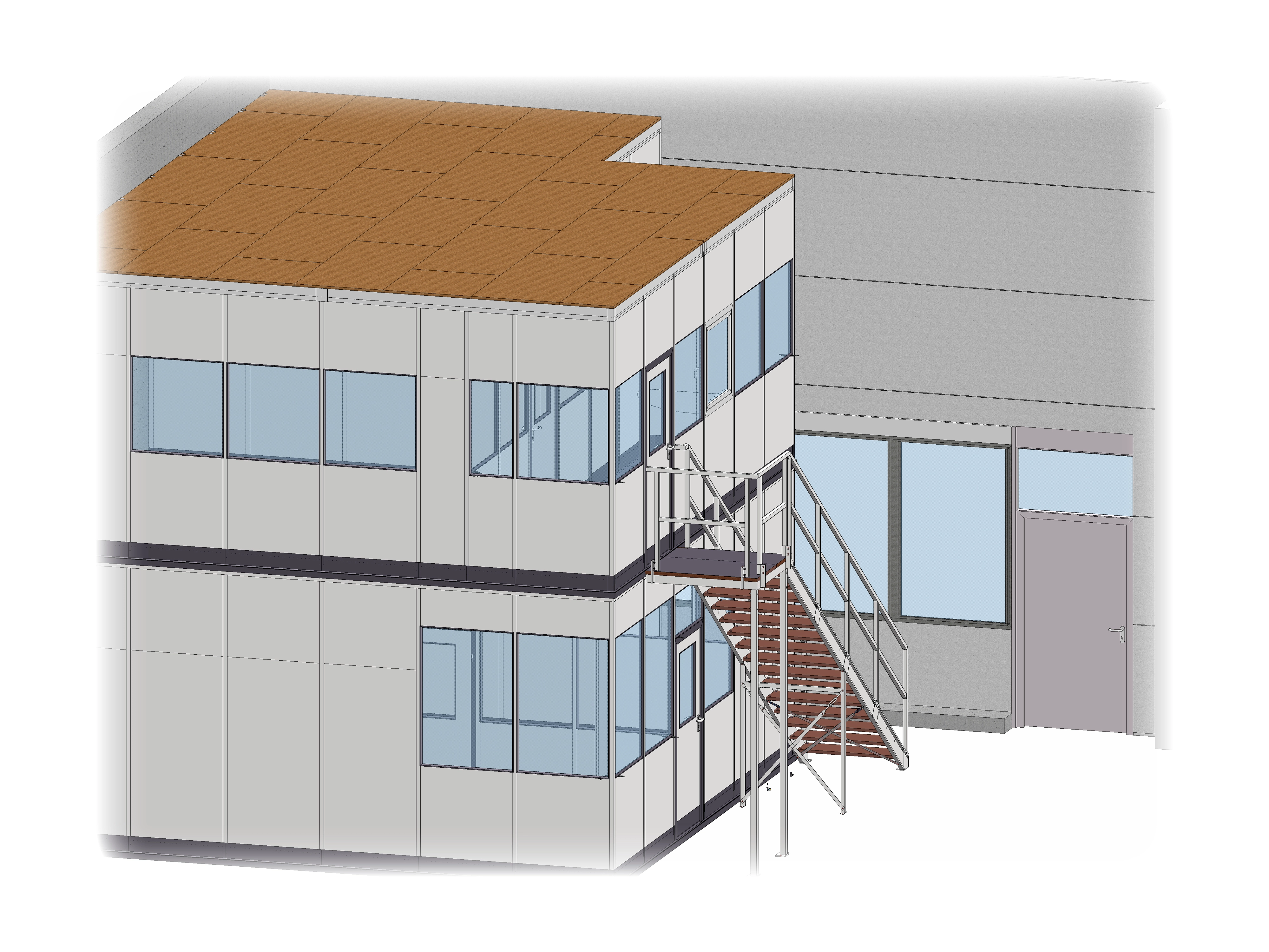 Ein Hersteller von Produkten für die Automobilindustrie fragte bei uns nach einem Doppelstockhallenbüro an. Das mehrgeschossige Objekt hatte ein Volumen von über 180 m³, was aufgrund unserer modulare konzeptionierten Raumsysteme aber kein Problem darstellte. Die Planungsphase beim Kunden war nach dem Aufmaß und der Abnahme der Zeichnungen fertig gestellt. Wie bei uns üblich, geschah dies in einem mehrstufigen Prozess, bei dem neueste Änderungen und besondere Anforderungen der spezifischen Branche des Kunden stets berücksichtigt werden konnten.