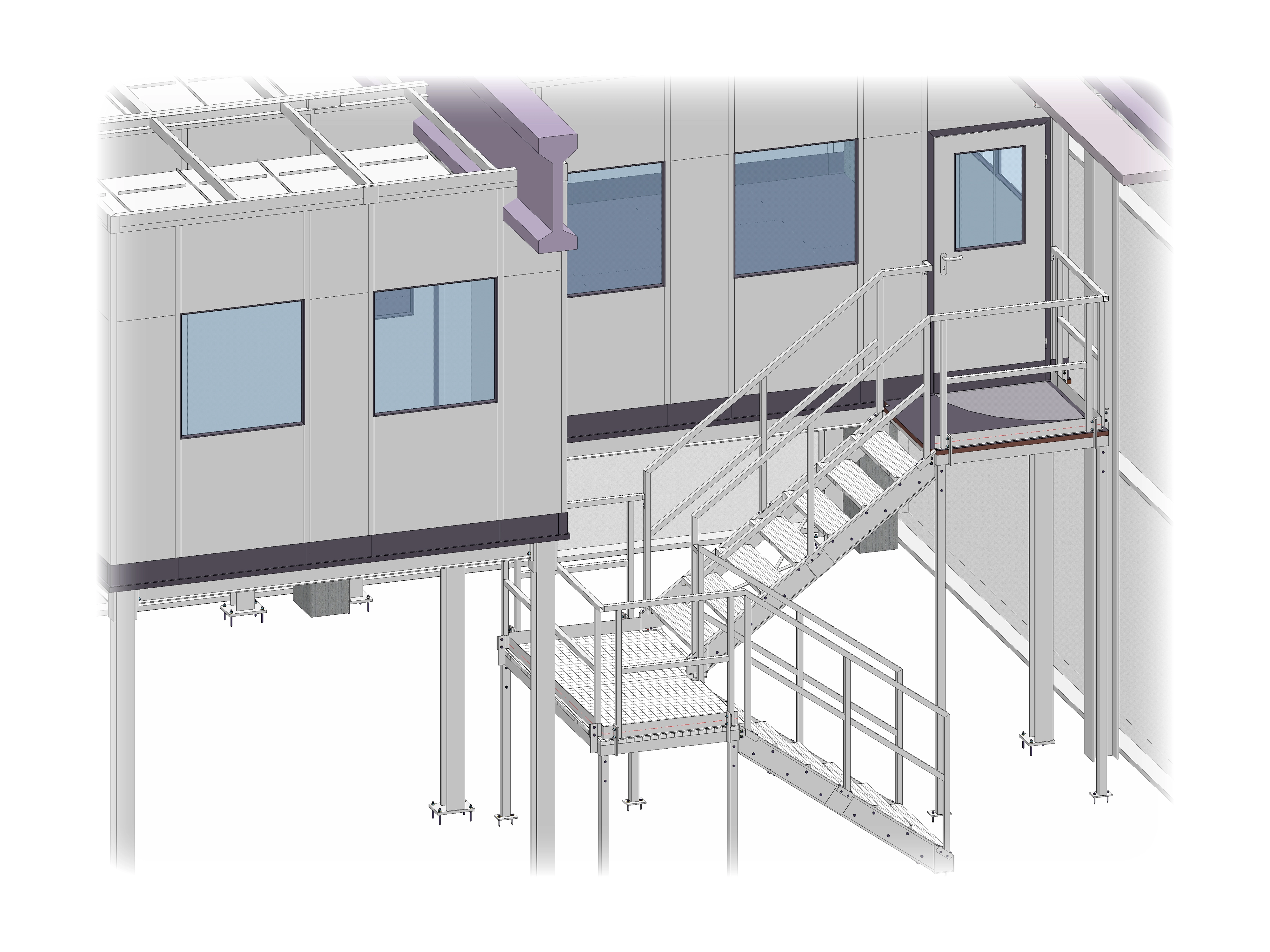 Raumzellen sind kleine Systemräume, welche durch einen separaten Eingang an einem beliebigen Punkt in der Halle montiert werden können. Dies schließt auch einen Einbau in beliebiger Höhe ein. Raumzellen sind damit schnelle und preiswerte Lösungen für einen punktuellen Raumbedarf. Außerdem tragen sie erheblich zur effizienten Raumnutzung des vorhandenen, umbauten Raumes bei. Ein Kunde aus der Konsumgüterproduktion frage bei uns nach mehreren Lösungen dieser Art zur Schaffung mehrerer Teamräume nach. Unser Vorschlag war ein zweiseitiges, mehrgeschossiges Objekt, welches an die bestehende Statik der Halle angepasst wurde. Nach der Erstellung einer plastischen 3D-Grafik konnte vor Ort beim Kunden das gewünschte Objekt so lange angepasst werden, bis die perfekte Lösung gefunden war. Mit der Berücksichtigung der besonderen Anforderungen an die Kundenbranche, war die Planungsphase zeitnah abgeschlossen und die Konstruktionszeichnungen konnten erstellt werden.