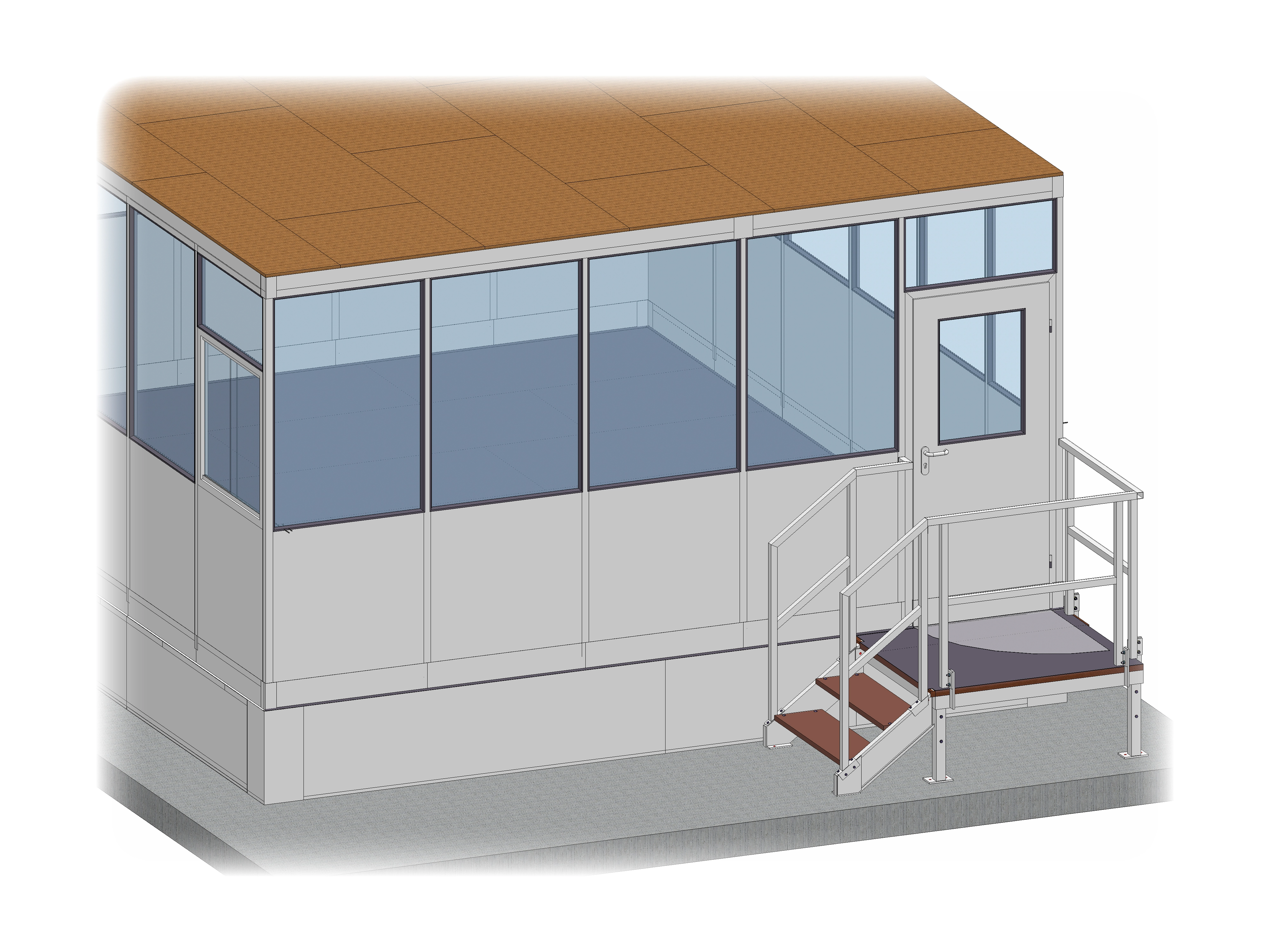 Besonderheiten - 4-seitiges Objekt, 570 mm Bühnensockel, Blechverkleidung Sockel, Treppenaufgang, Schiebefenster