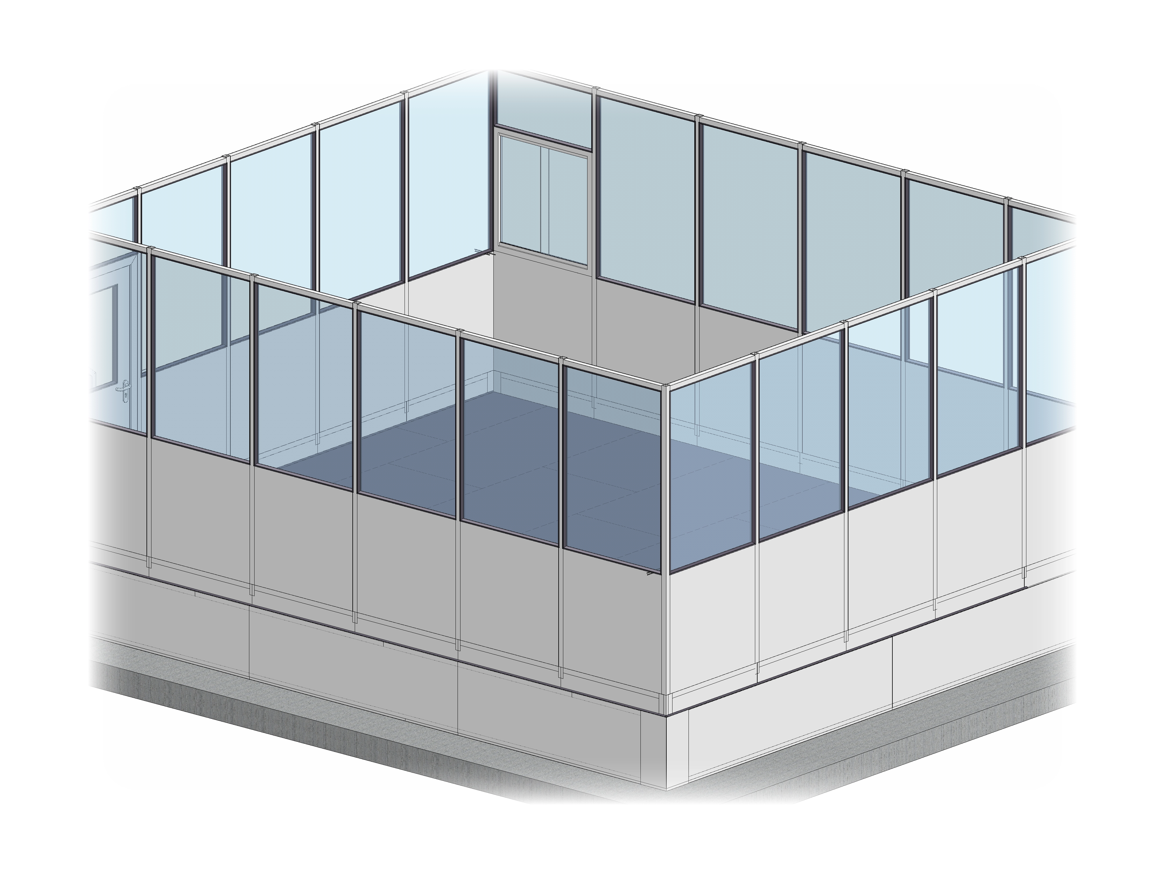 Der Bau von Pneumatikpumpen erfordert höchste Präzision und Qualität in allen Bereichen der Planung, Produktion und Qualitätskontrolle. Dennoch muss ein ausreichend hoher Ausstoß gehalten werden, um rentabel zu sein. Effiziente Halleneinbauten können dazu einen wichtigen Beitrag leisten. Ein Hersteller von Pneumatikpumpen brauchte für seine Produktion ein neues Betriebsbüro. Beim Besuch des Kunden konnte sich unser Planungsteam ein Bild von den Möglichkeiten vor Ort machen. Das Betriebsbüro sollte zur Koordinierung und Überwachung der gesamten Produktionskette dienen. Die Einzelteilfertigung, die Montage, die Testräume und der Versand sollten vom Betriebsbüro aus sichtbar und schnell zu erreichen sein. Dies machte eine zentrale Anordnung des Halleneinbaus notwendig. Ein vierseitiges Objekt mit einer Rundumverglasung war für unseren Kunden die optimale Lösung. Zur Schaffung der notwendigen Übersicht in der gesamten Halle, wurde das Betriebsbüro auf einen 570 Millimeter hohen Bühnensockel platziert. Eine Blechverkleidung schließt den Sockel ab, so dass kein Verschmutzungsherd entstehen kann. Die Verwendung eines Sockels macht einen Treppenaufgang erforderlich. Dieser fällt mit drei Stufen jedoch sehr moderat aus. Schiebefenster ermöglichen die Belüftung und die direkte Kommunikation zwischen den Mitarbeitern innerhalb und außerhalb des Betriebsbüros. Mit der Wahl auf Schiebefenster wird auch eine große Verletzungsgefahr ausgeschlossen. Unbeabsichtigte Kollisionen mit offen stehenden Fensterflügeln werden mit Schiebefenstern vermieden.