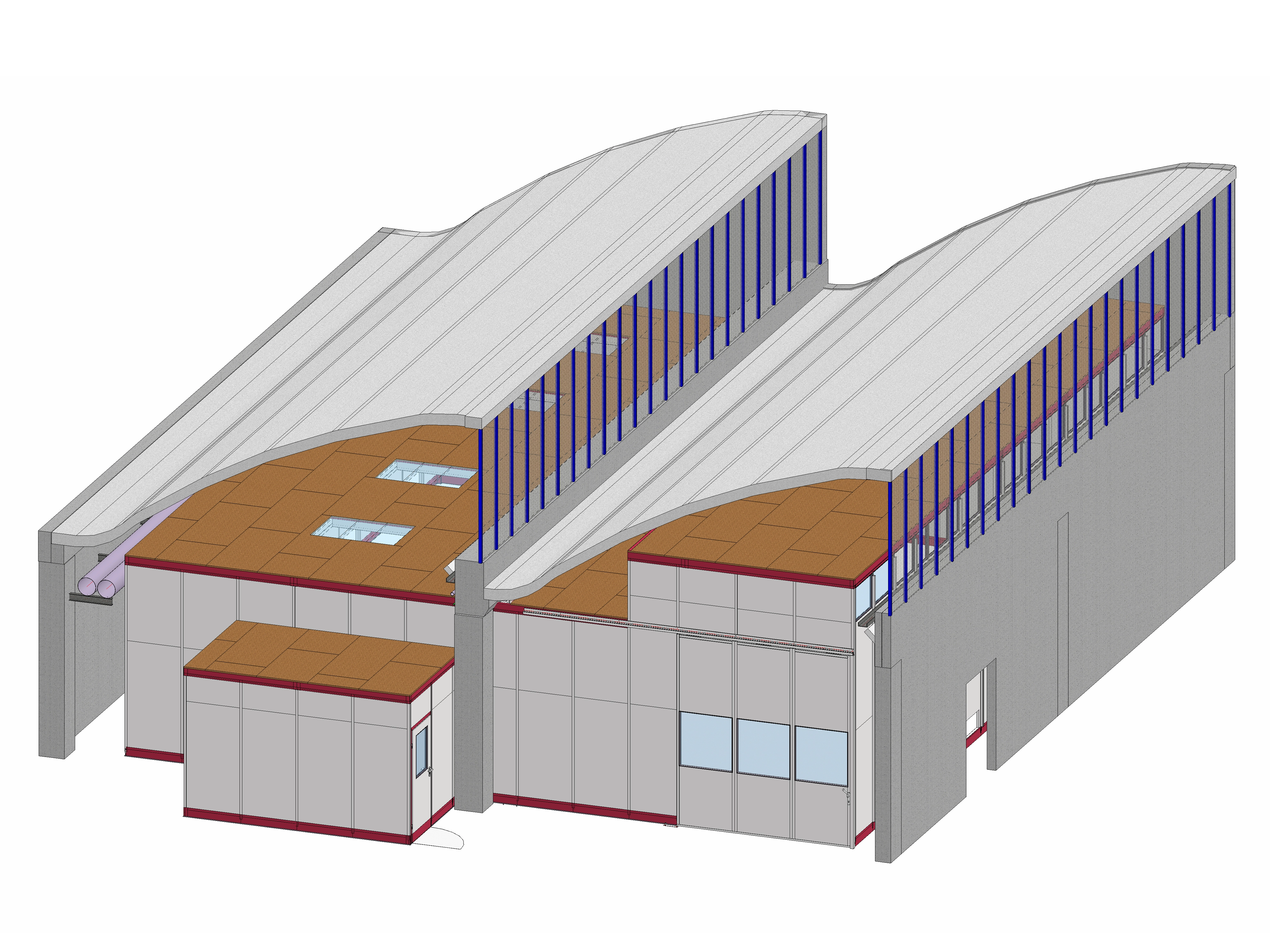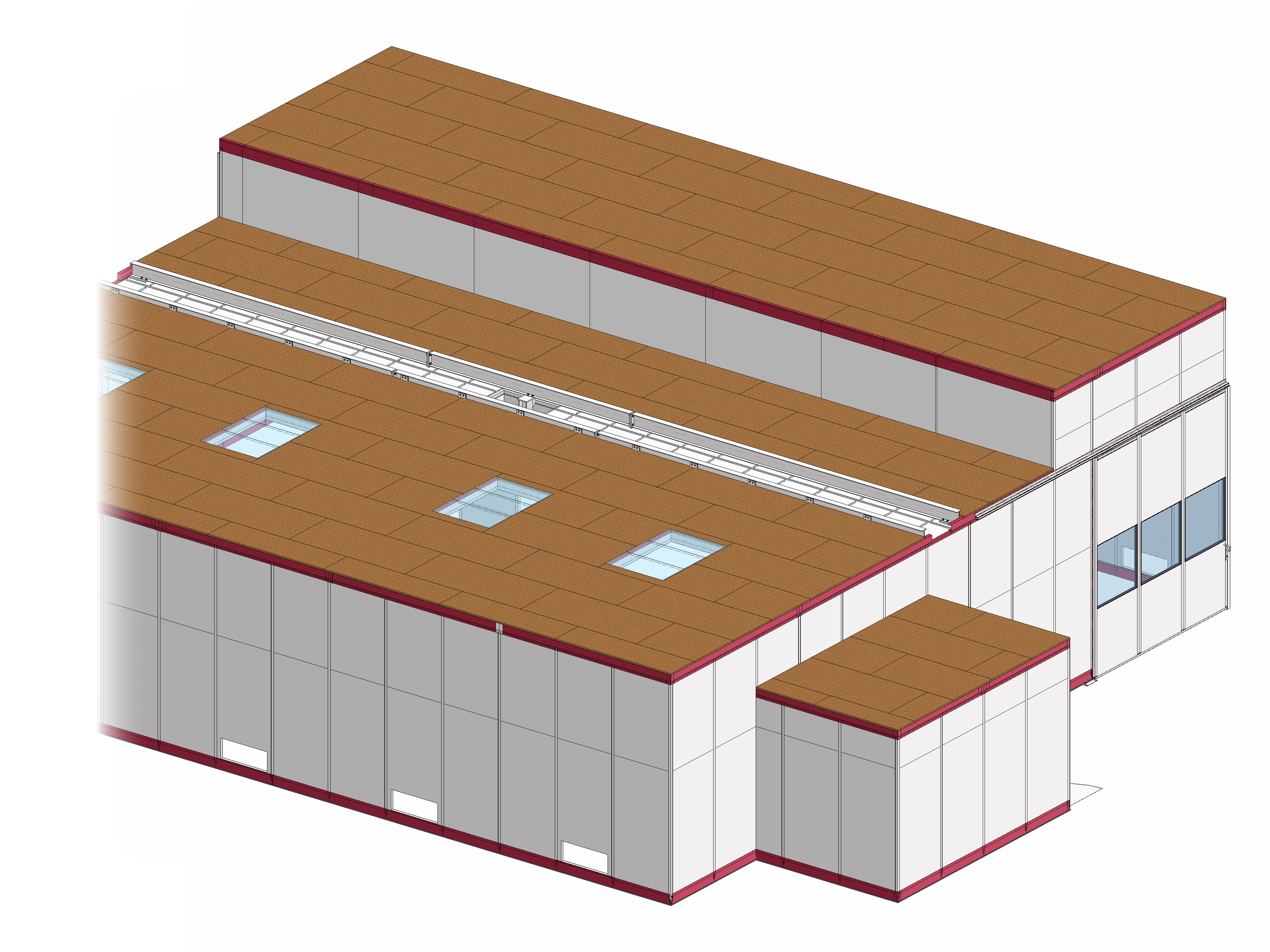 Raumzellen, Meisterbüros oder einfache Lagerbühnen sind in der Regel Ergänzungen, welche in eine bestehende Gebäude eingepasst werden. Diese kleinen und technisch übersichtlichen Projekte sind für uns Routineaufgaben, welche wir seit Jahren in bester Qualität lösen können. Gelegentlich tritt aber ein Kunde an uns heran, welcher ein besonders anspruchsvolles Projekt umsetzen möchte. So in diesem Fall: Mit einer Grundfläche von über 180 m² war der Wunsch eines Maschinenbaubetriebes nach einem neuen Raumsystem schon als Hallenneubau zu betrachten. Als "Halle in der Halle" war die Idee des Kunden, einem bestehenden Altgebäude durch einen intelligenten Einbau eine neue Nutzung geben zu können. Der Systemraum sollte zahlreiche Aufgaben erfüllen und flexibel einsetzbar sein. Trotz der anspruchsvollen Zielsetzung sollte ein enges Budget eingehalten werden. Da der Systemraum bis knapp unter die Hallendecke ausgeführt werden sollte, war eine begehbare Dachkonstruktion nicht nötig. Ein vollständig umbauter Raum war dennoch Wunsch des Kunden, weshalb wir eine Deckenkonstruktion aus Weitspannträgern vorgeschlagen haben. Ein integriertes Lichtband ermöglicht den Einfall von Sonnenlicht durch die verglaste Dachkonstruktion des Altbaus. Dies senkt die Energiekosten für die Tageslichtbeleuchtung. Mit einer Schleuse ist eine schallreduzierte Abgrenzung der Halleneinbauten zur Fertigung gewährleistet. Eine große Schiebetür erlaubt das Bestücken des Raumsystems mit sperrigen Gegenständen.