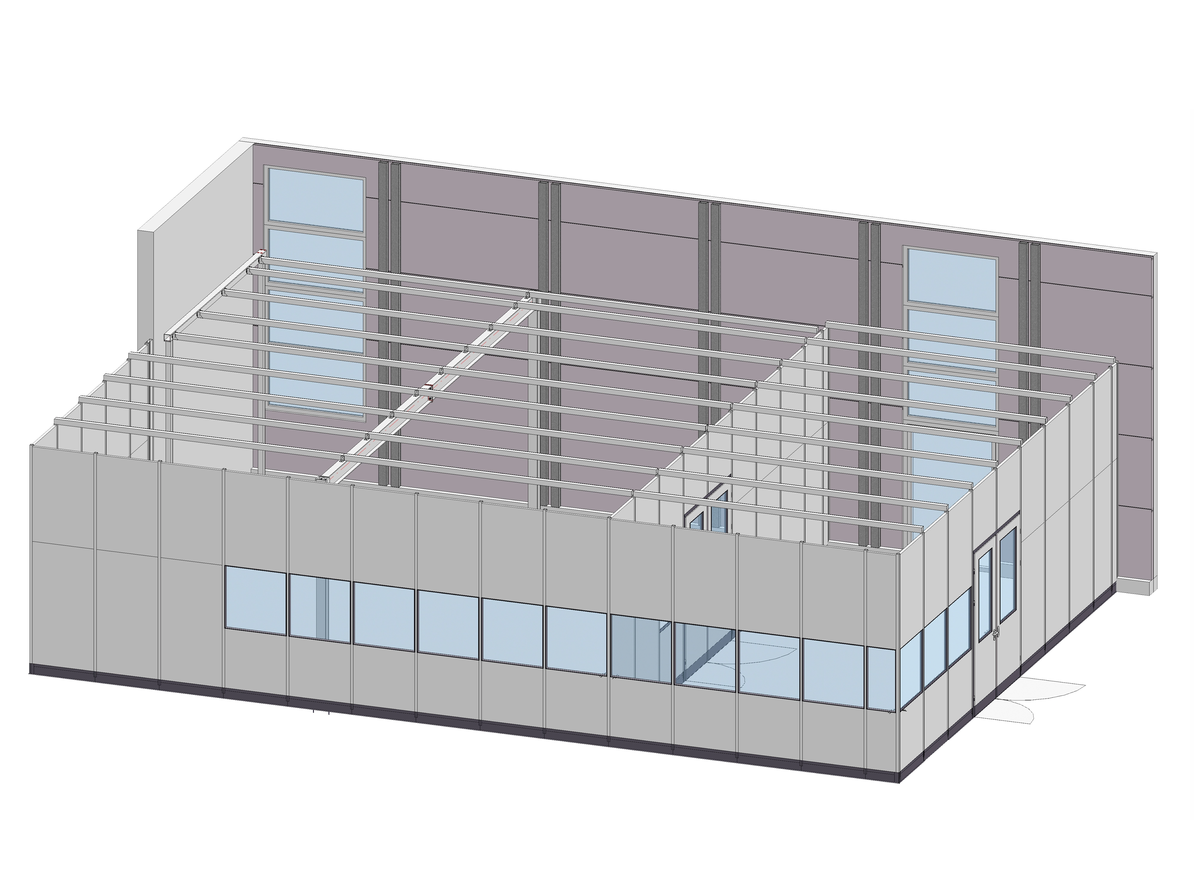 Besonderheiten - 3-seitiges Objekt, begehbare Deckenkonstruktion, Doppelflügeltür, Weitspannträger für Decke, Raumabtrennungen im Objekt, Wandanschluss, Raumhöhe 3.500 mm