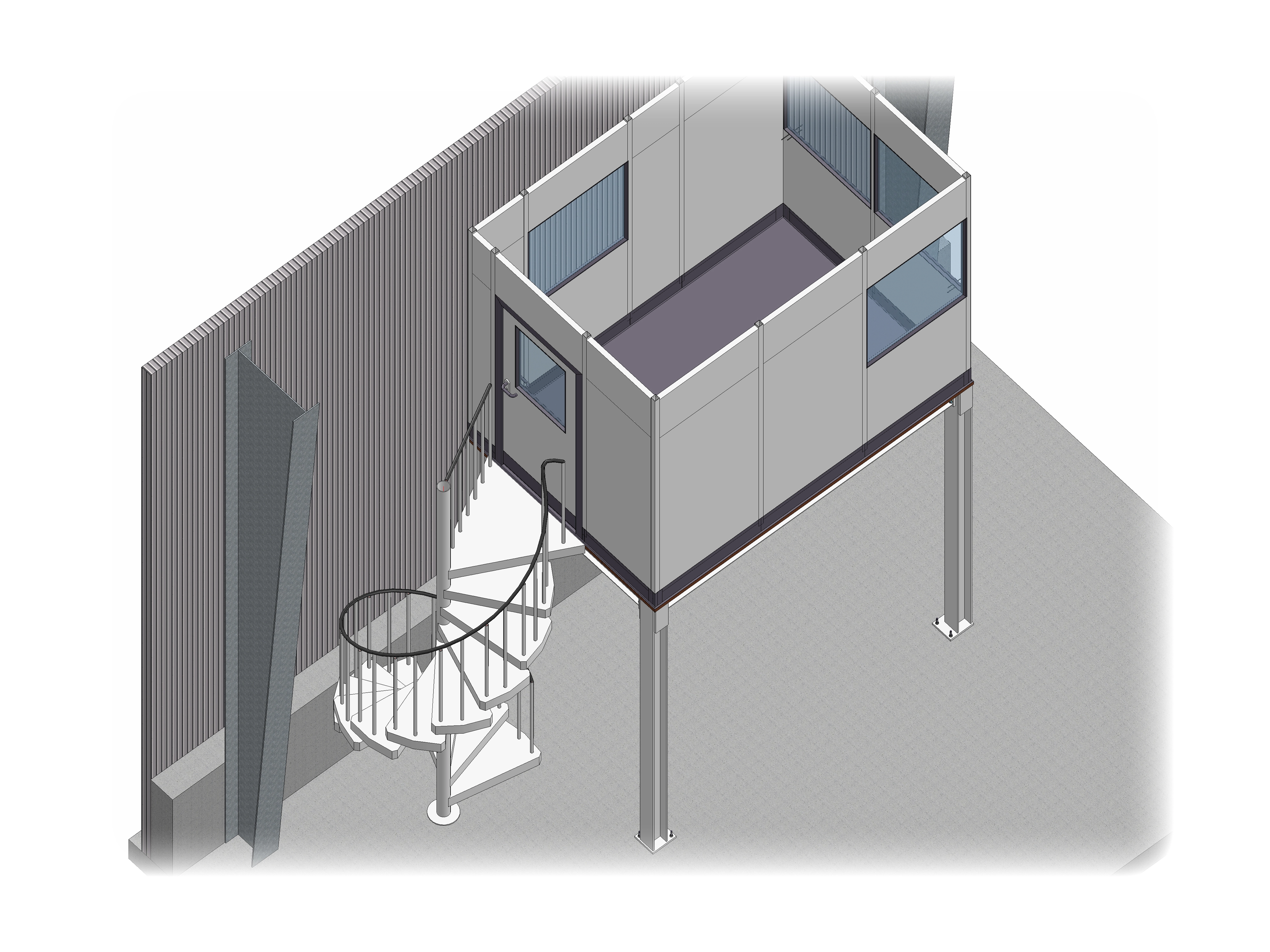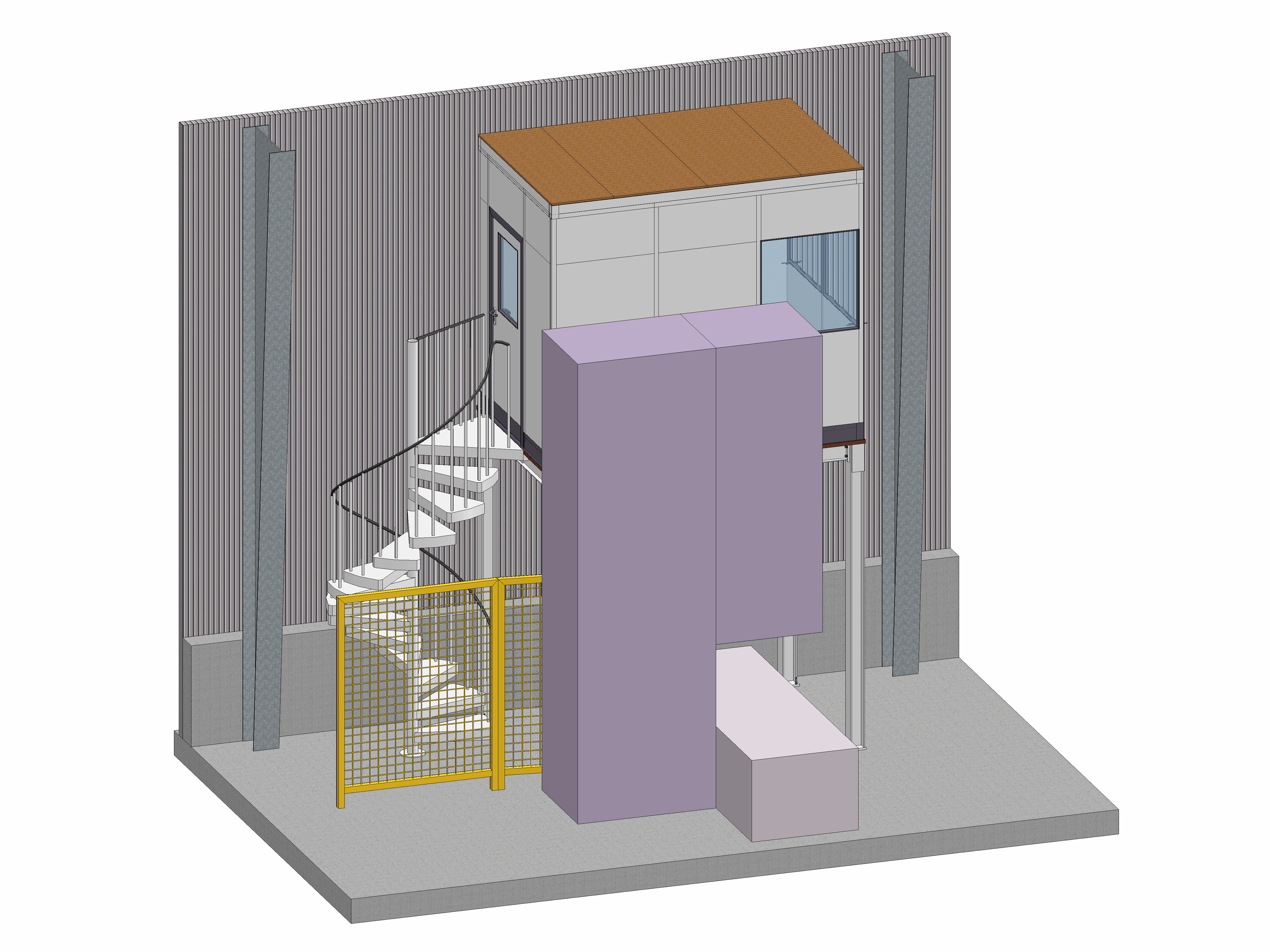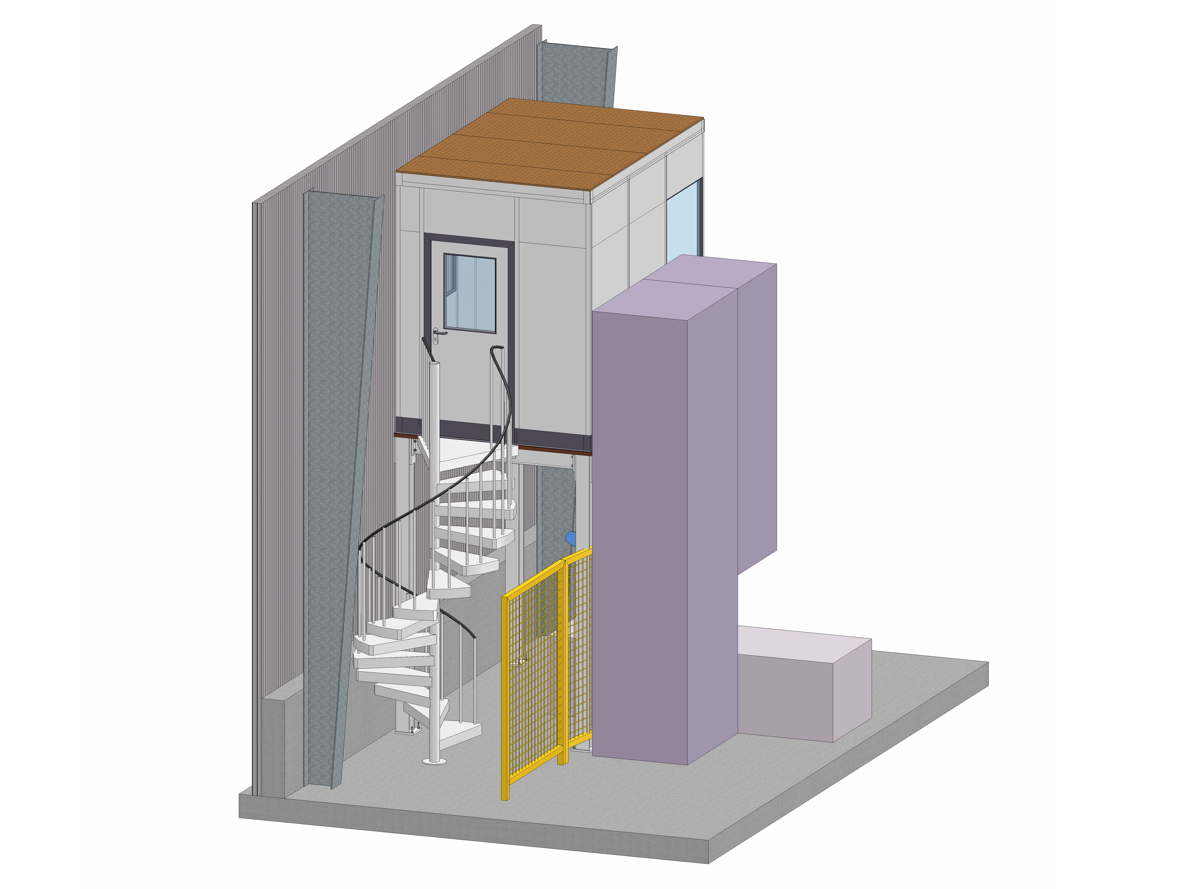 Die Gegebenheiten vor Ort führten uns zu einem Vorschlag, welcher als freistehendes, vierseitiges Hallenbüro vorsah und einer platzsparenden Wendeltreppe den größten Nutzen versprach. Dies wurde vom Kunden unter Berücksichtigung einiger besonderer Wünsche angenommen. Mit animierten 3D-Skizzen wurde unser Vorschlag mit den Vorstellungen des Kunden abgeglichen. Dies führte zur Freigabe, woraufhin unsere Konstruktion mit der Erstellung der Bauzeichnungen und Einzelteilzeichnungen beginnen konnte.