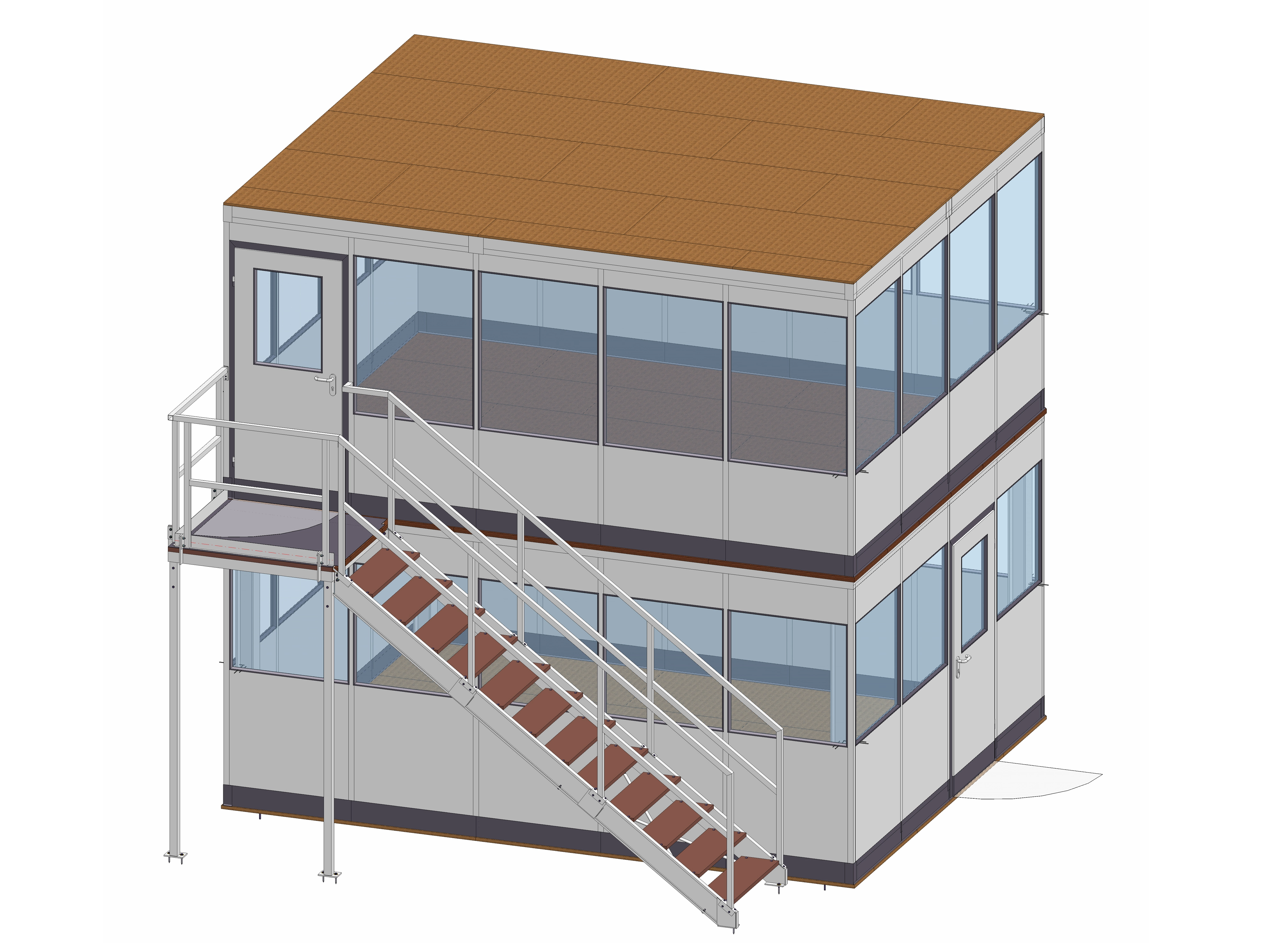 Große Lärmbelastung, hohe Schmutzproduktion und sehr wenig Platz: Das sind die Bedingungen in einer Holzverarbeitung. Das Transportieren, Wenden und Verarbeiten von großen Baumstämmen zu Brettern und Balken ist eine besondere, innerbetrieblich logistische Herausforderung. Hinzu kommt, dass Sägewerke in der Regel halboffen ausgeführt werden. Sie sind damit wesentlich stärker von der Witterung beeinflusst, als es andere Industrien sind. Koordination, Planung und Besprechung sind aber auch in der holzverarbeitenden Industrie eine elementare Voraussetzung für eine effiziente Produktion. Dazu sind geeignete Räume notwendig. Dies erkannte auch ein Kunde aus dieser Branche und fragte bei uns nach einer Lösung an. Unser erfahrener Außendienst konnte sich vor Ort ein Bild von den Bedingungen machen, welche beim Kunden herrschen. Einerseits war das Platzangebot sehr gering, andererseits waren die Anforderungen hoch: Auf gerade einmal 20 m² Grundfläche sollten maximal viele Arbeits- und Besprechungsräume aufgebaut werden. Neben der notwendigen Kommunikation, sollte in diesen Räumen auch die gesamte Produktion überwacht werden. Wir stellten uns auch dieser Herausforderung und schlugen dem Kunden ein vierseitiges, mehrgeschossiges Doppelstockhallenbüro vor. Im unteren Bereich waren leicht zugängliche Besprechungsräume untergebracht. Das Obergeschoss dient als ein Meisterbüro zur Überwachung der Anlage. Dazu war eine Rundumverglasung mit einer niedrigen Brusthöhe geeignet. Der Zugang zur zweiten Etage mit dem Meisterbüro wird durch einen Treppenaufgang gewährleistet. Der Kunde zeigte sich mit unserem Vorschlag zufrieden.