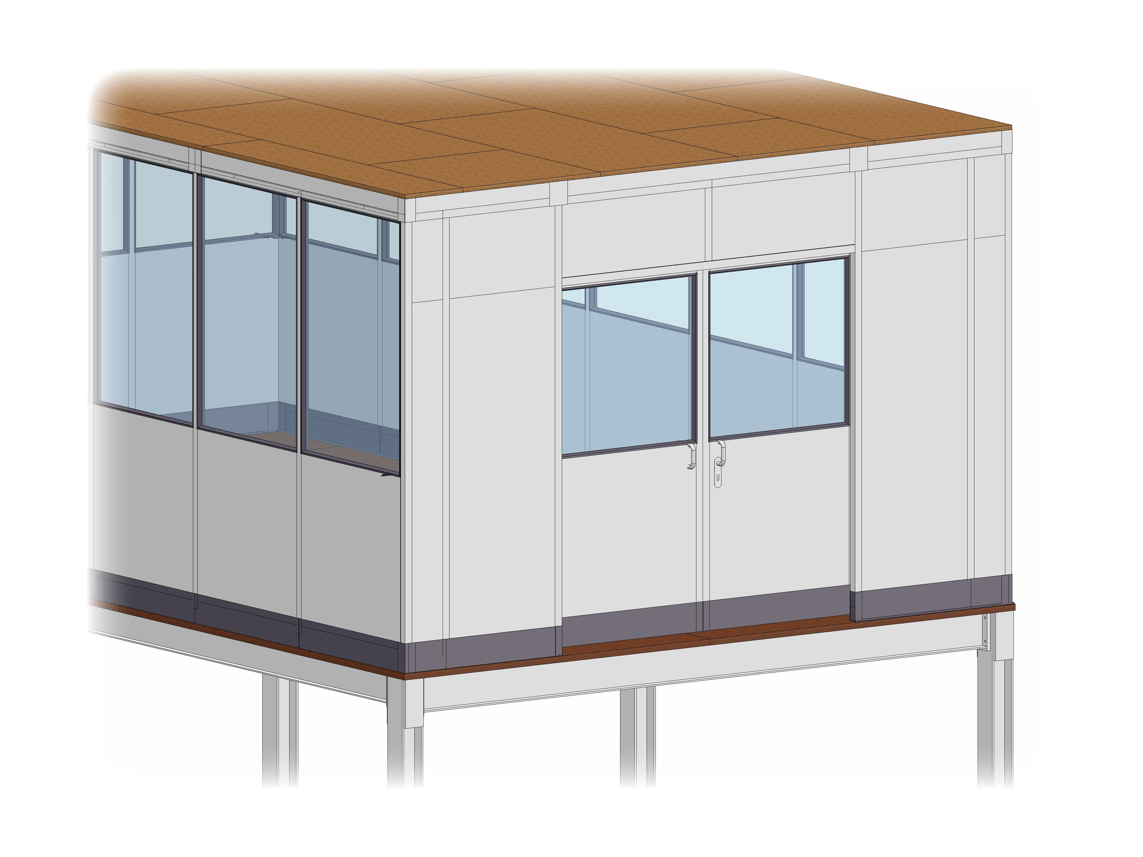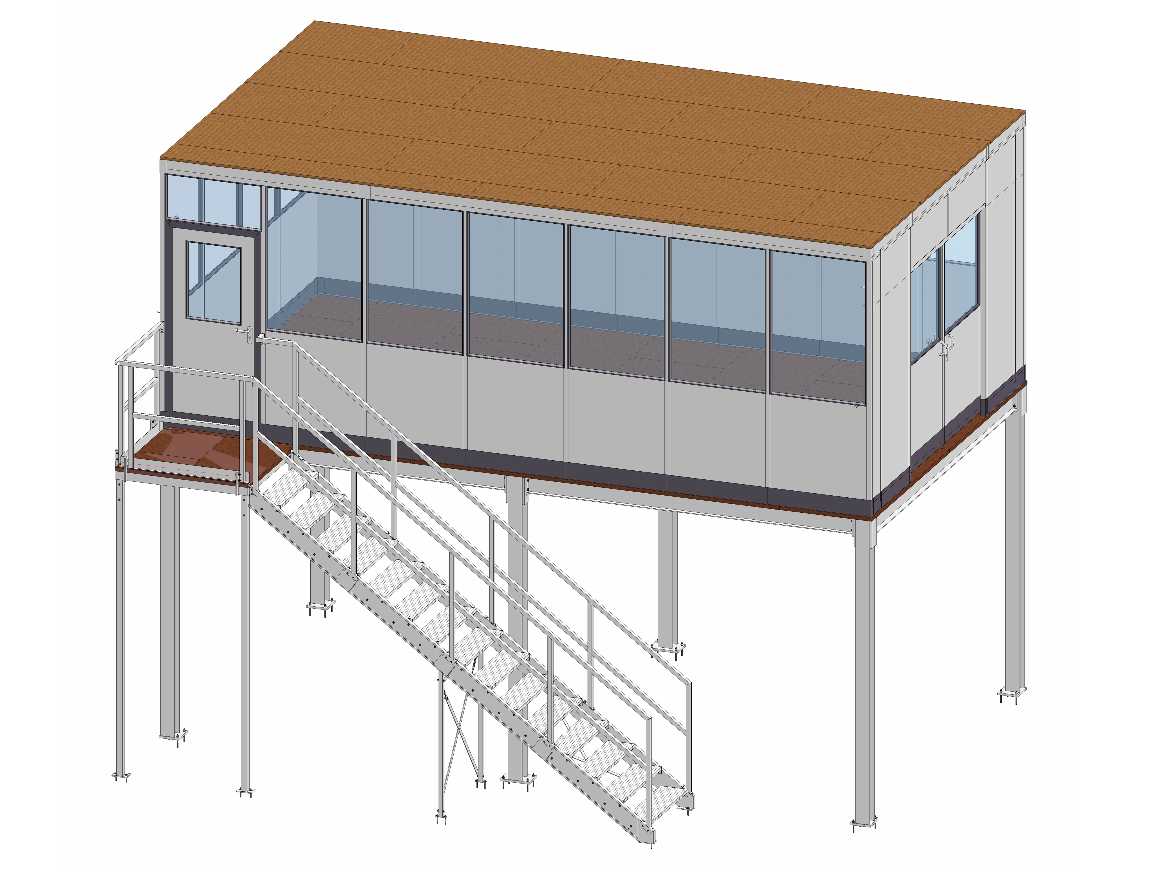 Besonderheiten - 4-seitiges Objekt, Hallenbüro auf Stahl, Vollelemente & Sichtelemente, Treppenaufgang, Doppelschiebetür, begehbare Deckenkonstruktion