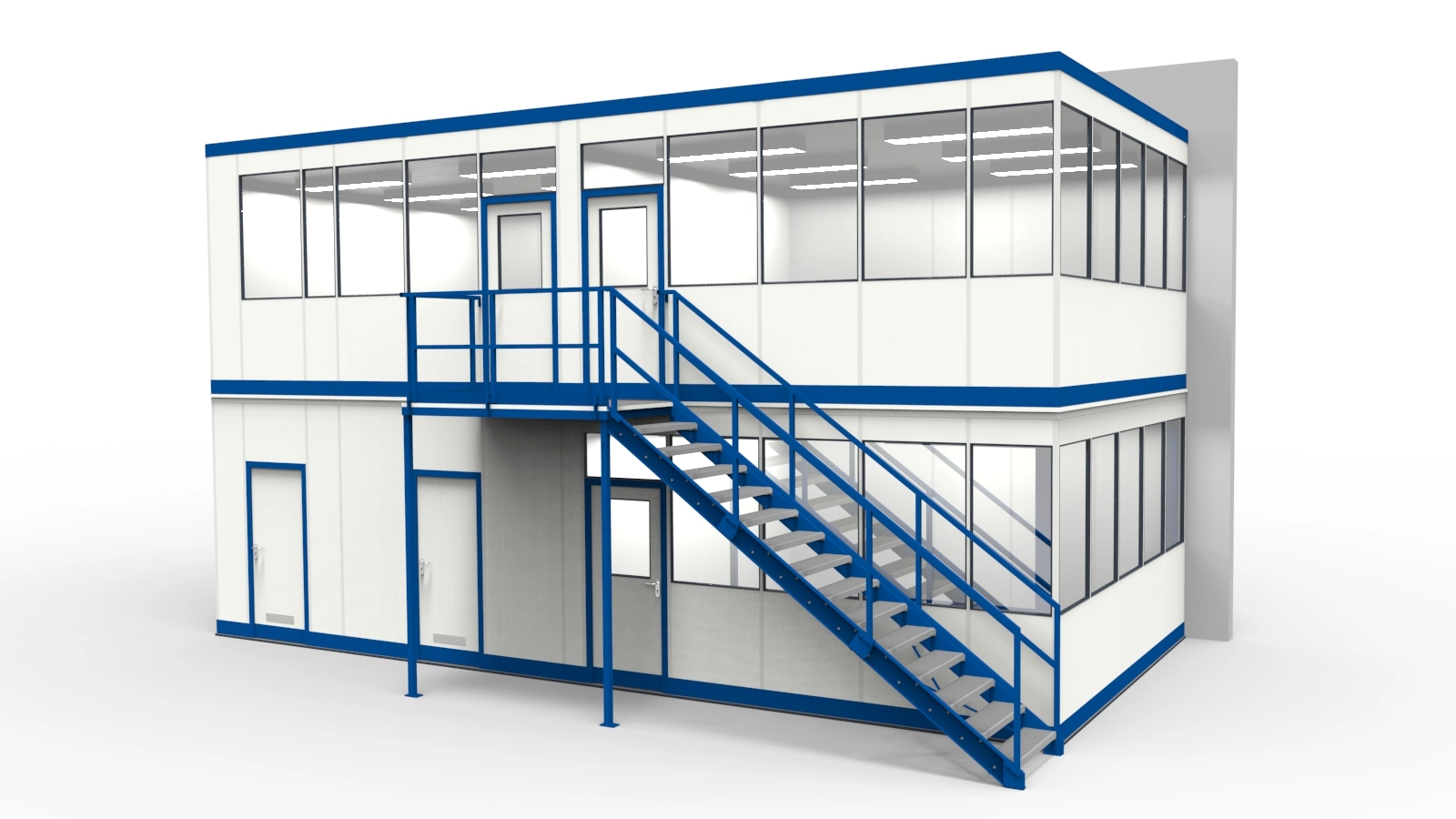 In einem Betrieb der kunststoffverarbeitenden Industrie, sollte innerhalb einer Industriehalle ein Raumsystem an einer vorhandenen Wand aus Blech entstehen. Obwohl die Möglichkeit einer dreiseitigen Lösung eines Hallenbüros bestand, entschied man sich aufgrund der schlechten Isolierung der Blechwand, gegen Kälte und Lärm, für eine geschlossene vierseitige Lösung. Um möglichst viel Platz einzusparen, wurde das doppelstöckige Hallenbüro so weit wie möglich an die vorhandene Wand gesetzt. Die Rückwand des Raumsystems wurde daher mit dem Elementtyp der geschlossenen Vollwand ausgeführt. Im Erdgeschoss des Objekts sollte ein Pausenraum in der Größe von ca. 25 m² entstehen. Zusätzlich sollten zwei Umkleideräume eingeplant werden, wo die Mitarbeiter in Spinten ihre persönlichen Sachen während der Arbeitszeit verwahren konnten. Zum Schutz der Privatsphäre wurden die Umkleideräume selbstverständlich mit geschlossenen Elementen ausgeführt. Die anderen Räume hingegen verfügen über Glasflächen wie möglich um an den Büroarbeitsplätzen so viel Tageslicht wie möglich zu erhalten. Im Obergeschoss hingegen sollten Büroarbeitsplätze in zwei getrennten Räumen entstehen. In jedem Raum konnten somit 3-4 Mitarbeiter untergebracht werden. Um eine möglichst ruhige Arbeitsatmosphäre zu schaffen, setzte man nicht auf ein Großraumbüro von 50 m² sondern teilte die Fläche auf zwei Räume auf. Die beiden Büros sollten jedoch nicht nur durch eine einzelne Tür erreicht werden können. Zu diesem Zweck erhielt jeder Raum eine separate Eingangstür und das Podest des Treppenaufgangs wurde verlängert. So konnten beide Räume über eine Treppe erreicht werden ohne eine kostspielige Konstruktion an der Lagerbühne anzubringen.