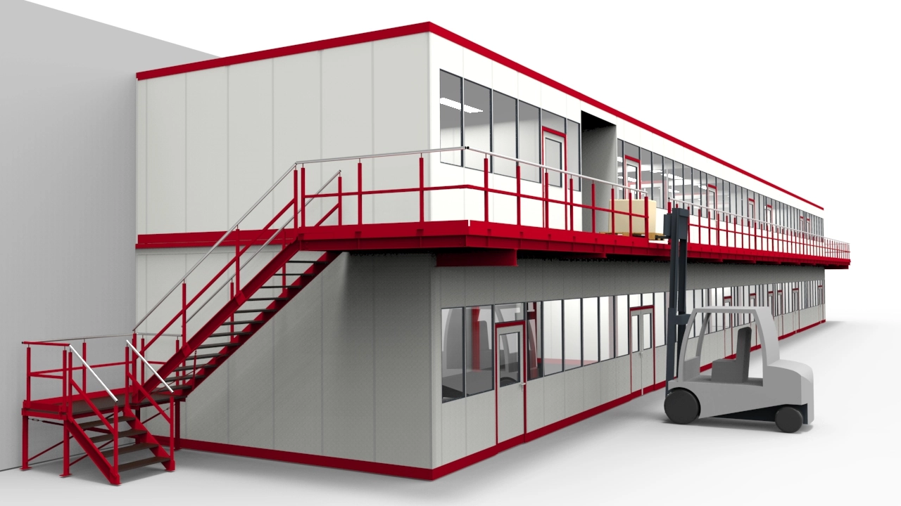 Dieses 45m lange Raumsystem bei einem Kunden des Automaten- und Maschinenbaus sollte die Abteilungen Qualitätssicherung, Arbeitsvorbereitung sowie Besprechungsräume inmitten der Produktionshalle vereinen. Weiter befinden sich in den Räumlichkeiten Aufenthaltsräume für die Mitarbeiter sowie entsprechende Flächen für eine ärztliche Notversorgung. Das doppelstöckige Raumsystem wurde mit entsprechenden Trennwänden des System RS 45 bereits in die einzelnen gewünschten Räume aufgeteilt. Eine Übergabestation im Obergeschoss sollte den Eintransport von Möbeln oder anderen Gütern ermöglichen. Durch den auskragenden Laufsteg vor dem Einbau, konnte die Grundfläche des Raumsystem sowohl im Erdgeschoss als auch im Obergeschoss vollständig genutzt werden. Bei einem eingerückten Laufsteg im Obergeschoss wäre wertvoller Platz verloren gegangen. Das Raumsystem verfügt über eine durchgehende Glasfront an der Vorderseite und wurde rückseitig an den vorhandenen Baukörper der Produktionshalle angeschlossen. An den Seiten wurde das Raumsystem mit Elementen vom Typ Vollelement geschlossen. An beiden Seiten wurden Treppenaufgänge angebracht. Diese dienen zum einen dazu das 45m lange Raumsystem von beiden Seiten begehen zu können und stellen einen zusätzlichen Fluchtweg zur Verfügung falls eine der beiden Treppen versperrt ist. Die Übergabestation an dem Laufsteg kann mit einem Schiebegeländer geöffnet werden und ermöglicht so den Eintransport von Möbeln und Gütern in das Obergeschoss, wie auf der Abbildung zu sehen. Nach einer Bauzeit von nur vier Wochen konnte dieses 45m lange und fast 7m hohe Raumsystem über zwei Ebenen vom Kunden bereits übernommen werden. Nach anschließender Ausstattung des Raumsystem mit Haustechnik wie Strom, Licht sowie Heizung und Klima können nun bis zu 60 Mitarbeiter inmitten der Produktionshalle ungestört und konzentriert arbeiten.
