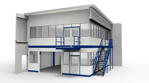 Ein Kunde aus der Werbetechnik suchte nach einem zweistöckigen Halleneinbau um seine Produktionsfläche abzutrennen und im Obergeschoss seine Lagerfläche zu erweitern. Im Produktionsbereich im Erdgeschoss sollten größere Maschinen zum Einsatz kommen, die Stoffe und andere Bahnenware veredeln und bearbeiten. Für den Eintransport der Stoffe und der Maschinen im Austausch, sollte die Möglichkeit bestehen ein Schnelllauftor an einem Wanddurchbruch zu befestigen. Eine zusätzliche reguläre Tür im Erdgeschoss sollte für den allgemeinen Personenverkehr eingesetzt werden. Die eingesetzte Lagerbühne zwischen dem Erdgeschoss und im Obergeschoss, sollte dazu dienen im Obergeschoss eine Lagerfläche mit 300 kg/m² zu ermöglichen. Der Zugang zur Lagerfläche im Obergeschoss wurde durch einen seitlich angesetzten Treppenaufgang gelöst. Um nicht alle Lagerteile über den Treppenaufgang einbringen zu müssen, wurde an der Vorderseite eine Doppelflügeltür und eine Auskragung als Übergabestation realisiert. An der Übergabestation konnten nun Lagerteile auf Paletten mittels eines Staplers abgesetzt werden und anschließend im Lager eingelagert werden. Durch die hohe Raumhöhe von 3.000 mm im Obergeschoss, war es möglich höhere Regale zur Einlagerung der Kleinteile zu verwenden. Die 2-seitige Raumlösung wurde in einer Ecke der bestehenden Lagerhalle installiert. So konnten zwei vorhandene Wände, sowie eine hinterseitige Fensterfront nach außen genutzt werden. Das Hallenbüro wurde an den Anschlussstellen an den vorhandenen Baukörper angepasst. Weiter wurde das Obergeschoss bis unter die Decke der bestehenden Lagerhalle gebaut. So konnte die Raumhöhe im Obergeschoss maximiert werden und auf eine zusätzliche Deckenkonstruktion für die Lagerfläche verzichtet werden. In beiden Etagen kamen Rasterdecken zum Einsatz um Elektroinstallationen zu verstauen und Lampen zur Beleuchtung der Räume systematisch einzusetzen.