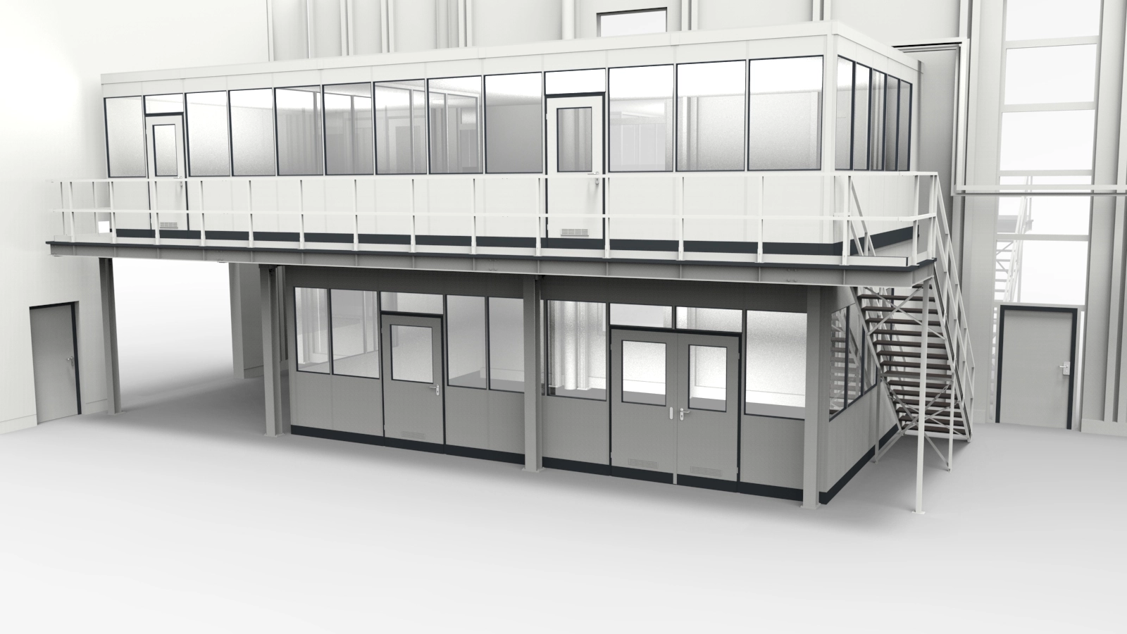 Besonderheiten - Lagerbüro als doppelstöckige Ausführung, Auskragung für Laufsteg im OG, Trennwand im EG hinter dem Stahl eingerückt, Isolierverglasung 21 mm