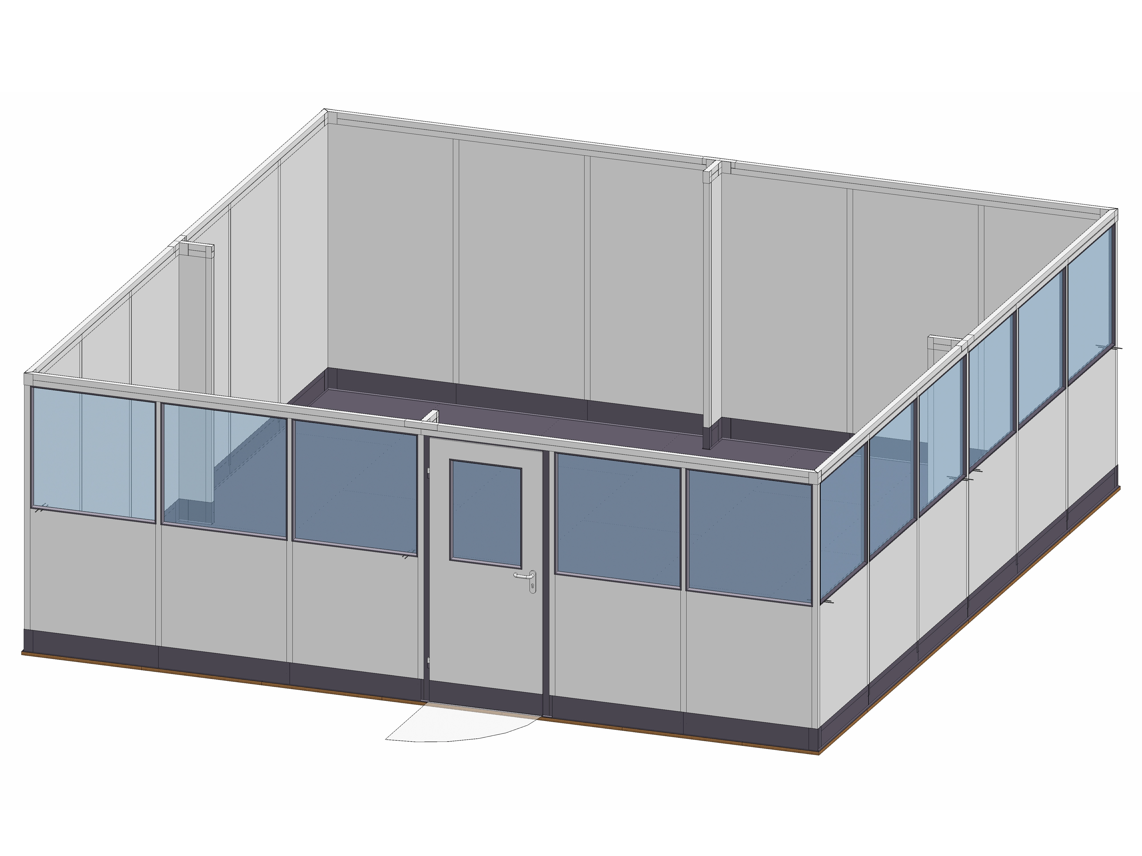 Besonderheiten - 4-seitiges Objekt, Freistehende Stellwandanlage, Vollelemente & Sichtelemente, Stützelement, Stabilisierungsprofil, Boden mit PVC-Belag