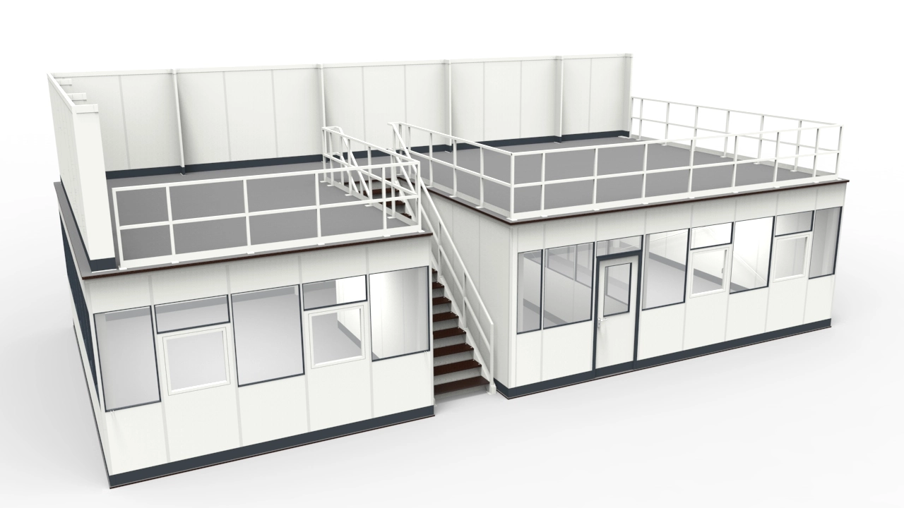 Bei einem Kunden, der sich mit der Verarbeitung von Kunststoffteilen befasst, sollte eine bestehende Lagerbühne als Hallenbüro umfunktioniert werden. Weiter sollte im Obergeschoss einen Sichtschutz entstehen. Der eigentliche Zweck der bestehenden Lagerbühne, Waren innerhalb eines Lagers auf einer zweiten Ebene einzulagern, wurde somit vollumfänglich verändert. Durch die Umbauung der Konstruktion entstanden im Erdgeschoss drei einzelne Büroräume mit unterschiedlichen Größen und Formen. Bei der Auslegung der Räumlichkeiten mussten die Stützen der Lagerbühne selbstverständlich bedacht und mit eingeplant werden. Der Einbau von mehreren Fenstern, die sich öffnen lassen sollten, ermöglicht einen Luftaustausch und dient gleichzeitig der Kommunikation nach außen. Durch den nachträglich eingebauten Fußboden im Erdgeschoss, entstanden hier Büroräume auf einer Grundfläche mit einem PVC-Belag. Der innen liegende Treppenaufgang zum entstandenen Dach des Hallenbüros wurde aus hygienischen Gründen hinter den Stufen verkleidet. Im Obergeschoss entstand neben der Absturzsicherung eine Stellwandanlage. Die Stellwand dient nicht nur der optischen Abtrennung des Lagergutes. Im Gegensatz zu einem flachen Geländer ermöglicht die Steilwand mit einer Höhe von 2 m eine höhere Stapelung des Lagergutes. Die Flächenlast der bestehenden Lagerbühne wurde durch die Nutzung des Erdgeschosses als Hallenbüro nicht verändert oder beeinträchtigt. Nachträglich besteht sogar die Möglichkeit, im Obergeschoss auf der Lagerbühne noch weitere Raumsysteme wie Hallenbüros oder ein Pausenraum zu errichten.