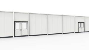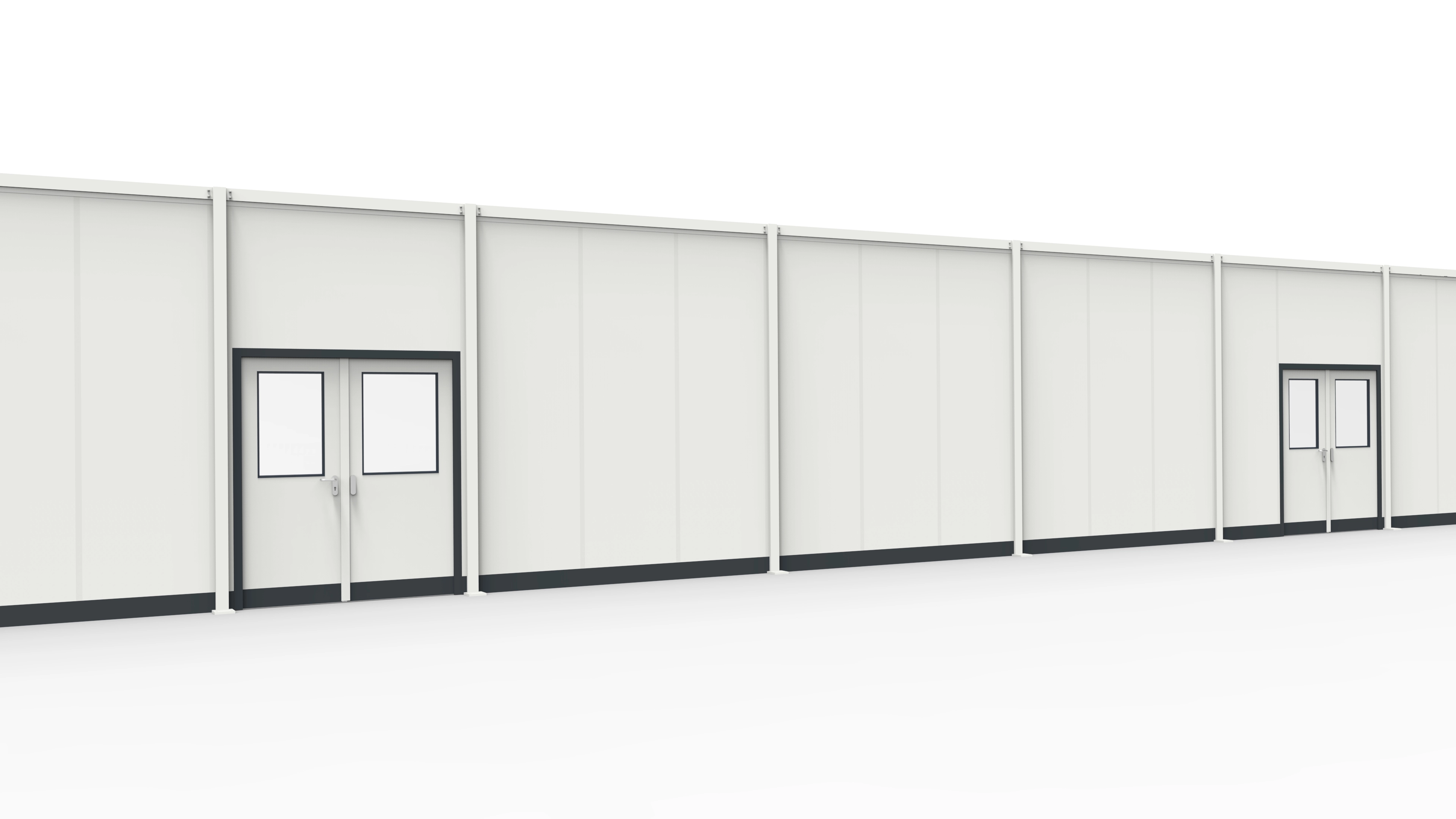 In einem Betonwerk wurden wir vor die Herausforderung gestellt eine knapp 25 m lange Stellwand zu errichten. Die Anforderung des Kunden an dieser Stelle war die Stellwand so hoch wie möglich zu machen. Ein Anschluss an die vorhandene Deckenkonstruktion der Halle sollte nicht erfolgen. Ein seitlicher Anschluss an den Baukörper wiederum war kundenseitig gewünscht. Die regulären Bauhöhen von Stellwänden mit dem System RS 45 liegen zwischen 2000 mm und 2500 mm. Der Wunsch des Kunden an dieser Stelle war diese Bauhöhen deutlich zu erhöhen. Nach Prüfung und Eignung der Bodenplatte beim Kunden konnten wir eine Stellwand mit einer Höhe von 3500 mm errichten. Die senkrechten Stützrohre zwischen den Wandelementen stabilisieren die Trennwand alle 3 m. Eine große Fußplatte an den Stützrohren werden mit entsprechenden Befestigungsankern im Hallenboden fixiert. So sind bei Stellwänden ohne Deckenanschluss auch Bauhöhen von über 3 m umsetzbar. Die eingesetzten Doppelflügeltüren aus dem System RS 45 rundeten dieses Projekt ab. Der Kunde kann diese Stellwand jederzeit schadensfrei demontieren und die Produktionshalle als Ganzes wieder nutzen. Im Vergleich zu einer festen Hallenabtrennung aus Trockenbau oder Isopaneelen, bieten Abtrennungen aus modularen Systemtrennwänden nachhaltige Vorteile bei späteren Veränderungen. Die demontierten Einzelteile aus der Stellwand sind beispielsweise auch für die Errichtung eines Hallenbüros oder Meisterbüros nutzbar.