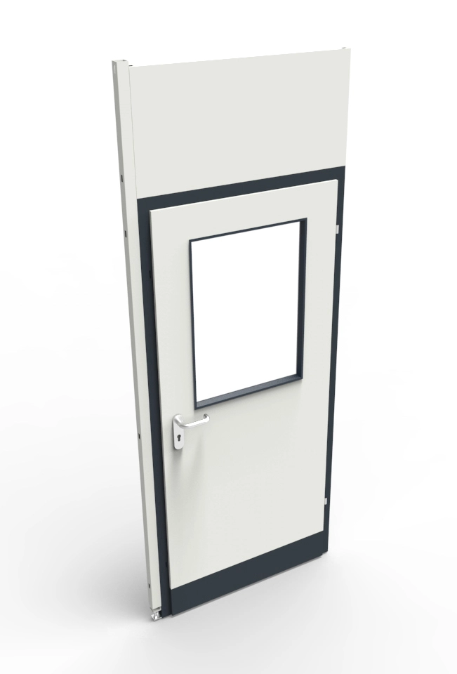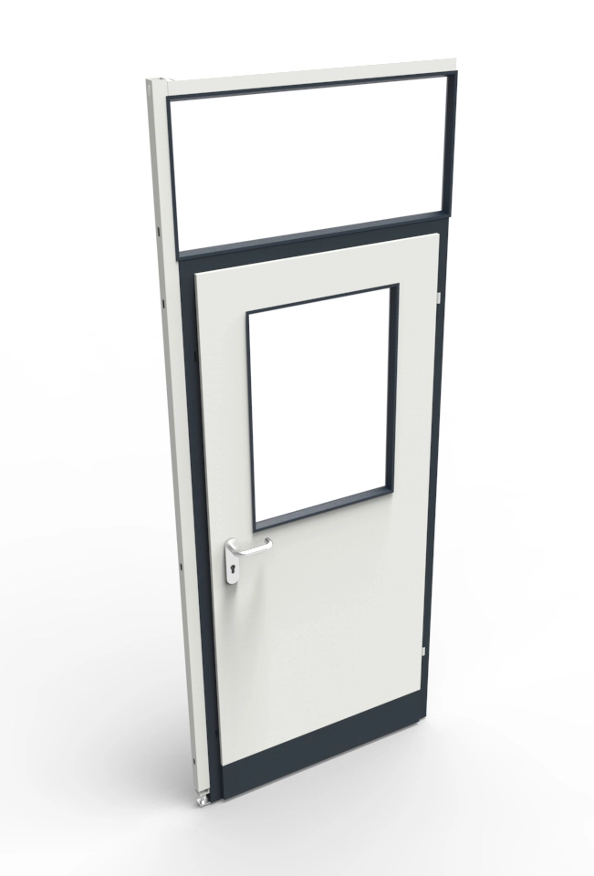 Das Türsichtelement passt optisch zu dem Wandelement des Typs Sichtelement und eignet sich speziell für Raumsysteme die viel Tageslicht haben sollen. Die Glasscheibe über der Zarge wird in der selben Glasvariante ausgeführt wie auch die verglasten Nebenwände. Die Glasscheibe im Türflügel ist aus Sicherheitsgründen grundsätzlich ein Sicherheitsglas. Die Beschläge des Türsichtelement können mit einem Zylinderschloss verschlossen werden und lassen sich bei Bedarf einseitig oder beidseitig mit einem Knauf ausstatten.